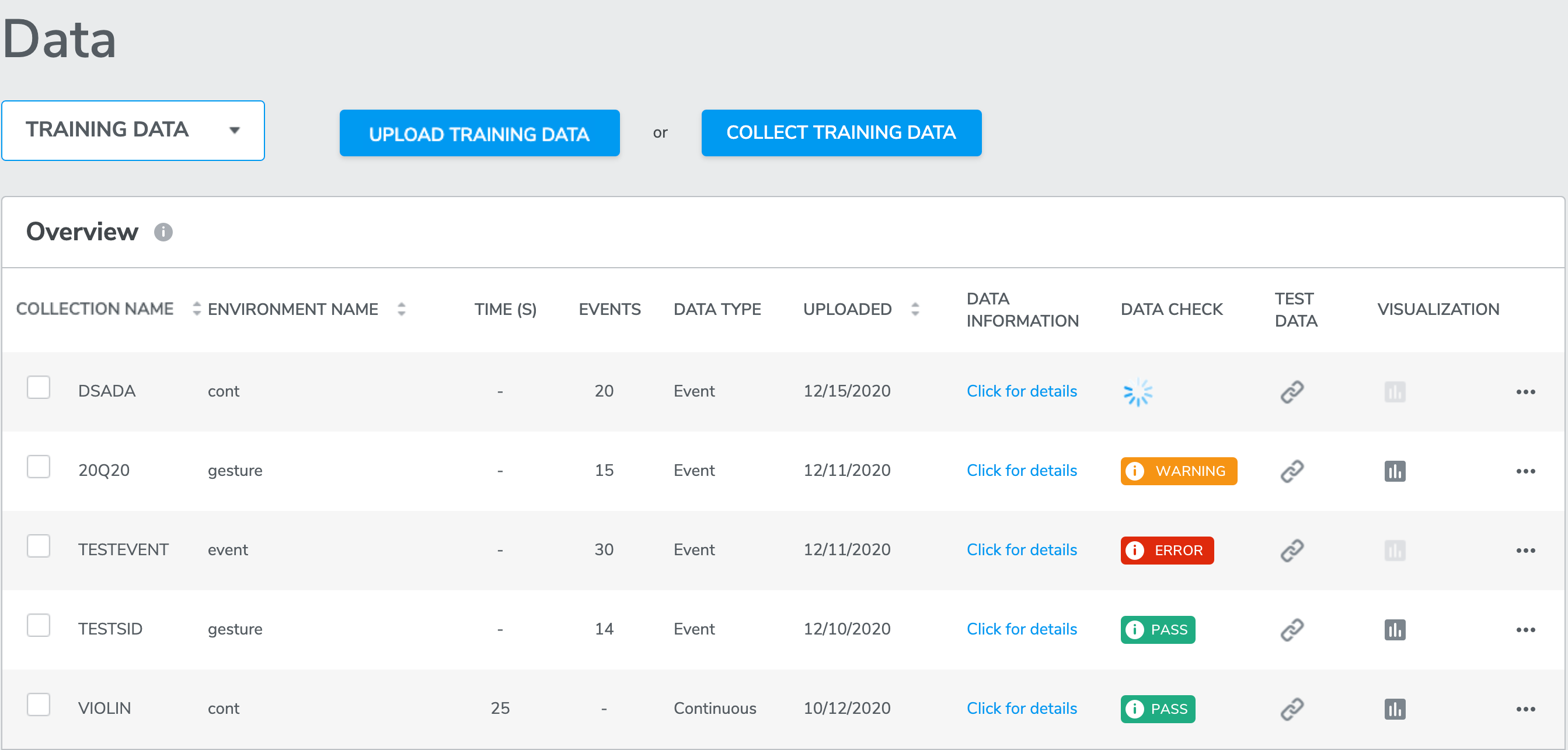 Other than collecting training data, you could also choose option of upload training data. From the Data page, you may upload previously-collected datasets to AutoML directly. These uploaded datasets can be used to train machine learning models, and can be combined with additional data that has been collected through the Qeexo AutoML platform.