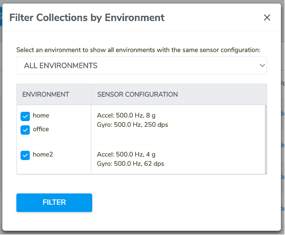 FILTER ENVIRONMENT enables you to filter your data collections with different environments settings and sensor configurations settings.
