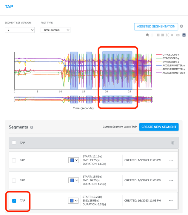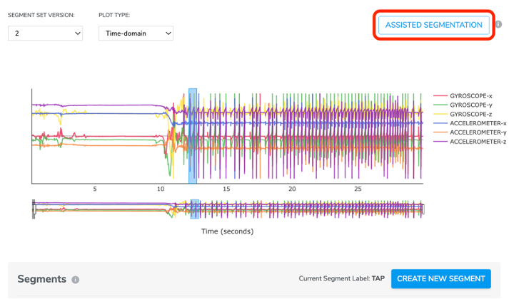 At the time of training Qeexo AutoML saves a recallable SEGMENT SET VERSION of your segments, selecting any available version from the SEGMENT SET VERSION drop-down menu will restore the segments for that collection. Once restored, new segments may be created and / or existing segments may be deleted before using the collection in training.