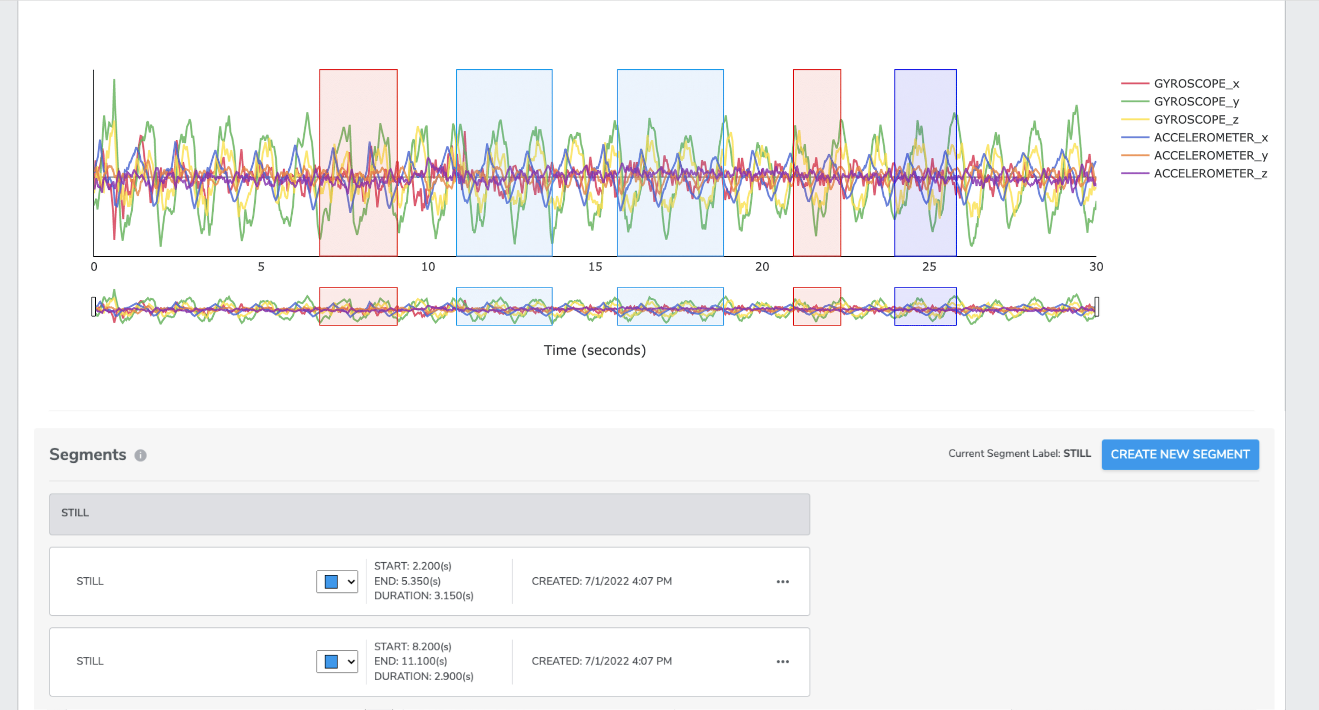 However, at this moment, Qeexo AutoML data segmentation feature DOES NOT allow for editing of a segment’s start / stop point selection. In order to modify a segment following creation, simply select Delete through the segment’s … ellipse menu and recreate the segment using the process above.