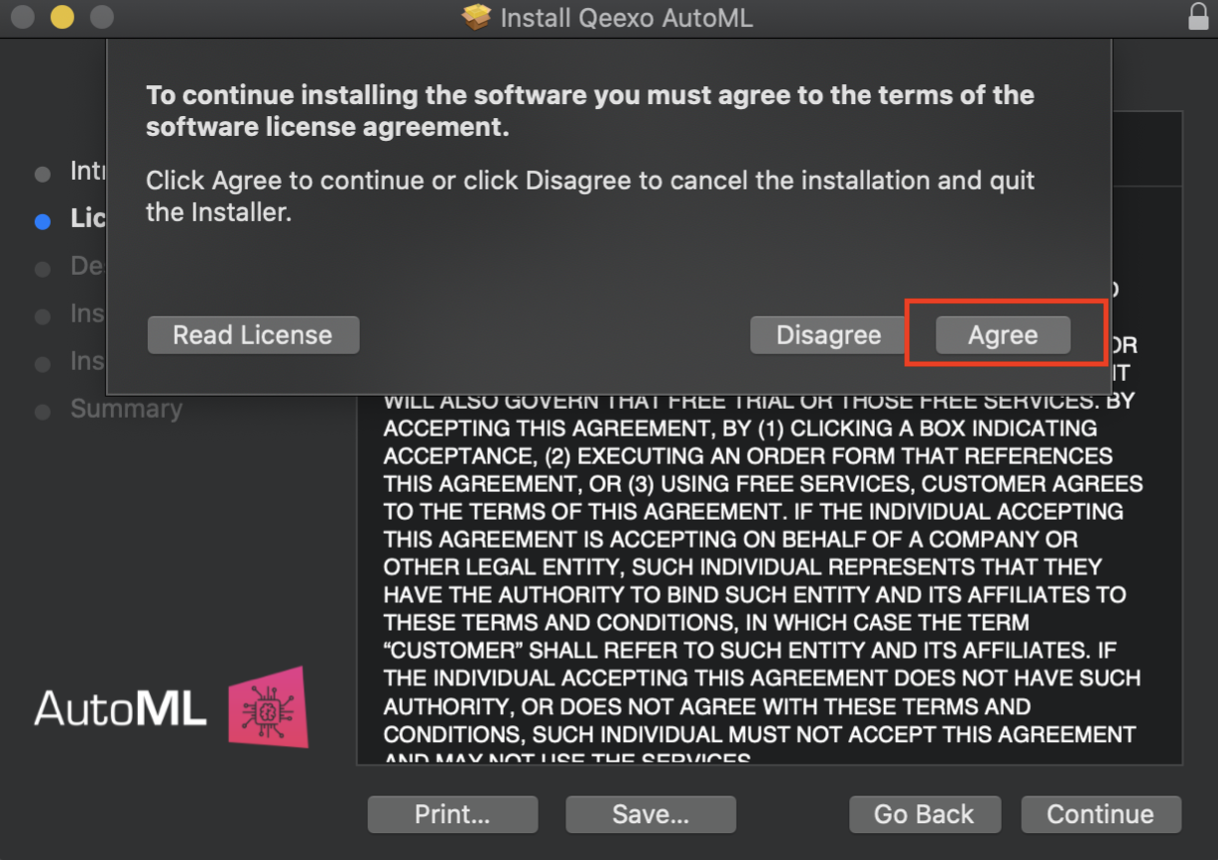 3. Click Continue, then read and click Agree on the license agreement to continue installing.